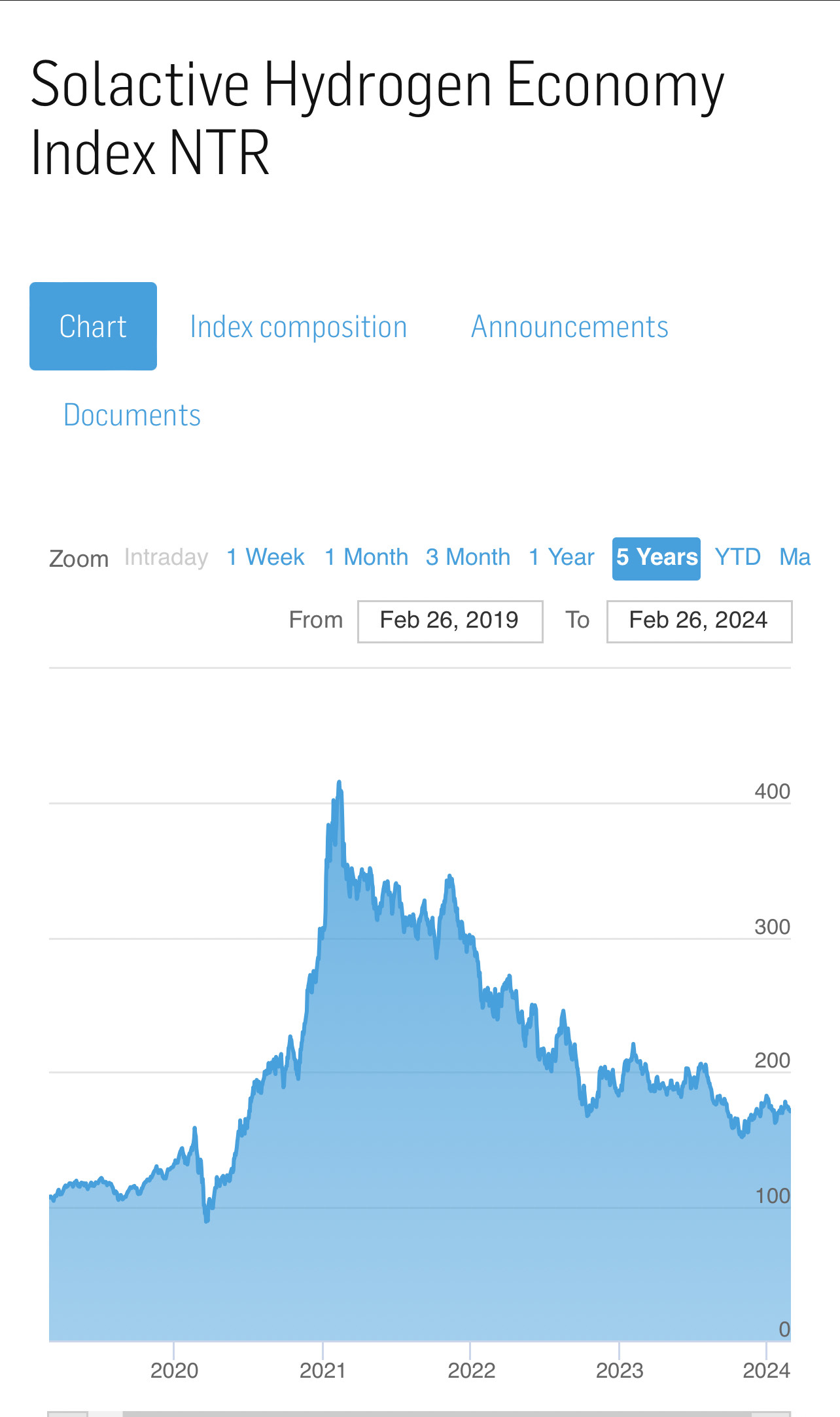 L’indice in questione è quello che dal brusco calo dovuto al Covid probabilmente ha performato meglio. Peccato che come spesso accade i gestori di etf si sono ‘lanciati’ nel settore in ritardo, collocando e promuovendo servizi su Hydrogeno ai massimi. Questo è l’indice sottostante di riferimento di un importante etf che oggi non cito, collocato sui massimi a 10 ed ora a circa 4. Questo spiega perché non bisogna mai fidarsi delle riviste online (oggi il tema e’ NVDA) e un monito ai consulenti improvvisati (risparmiatori) attirati dal denaro facile. Bisogna sempre farsi guidare e avere delle regole di ingaggio.